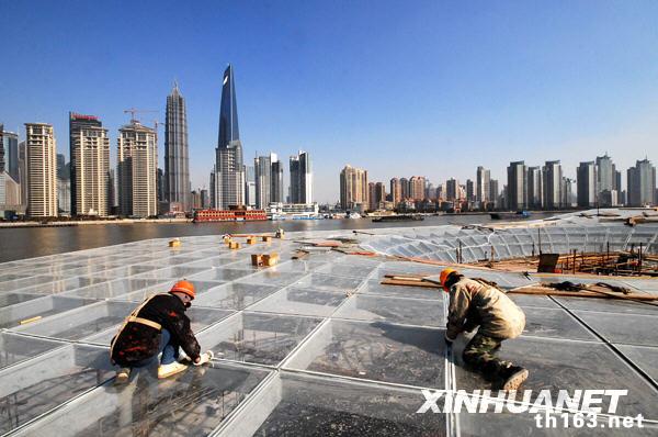 1月26日,工人在即将建成竣工的上海十六铺世博水门施工。新华社发